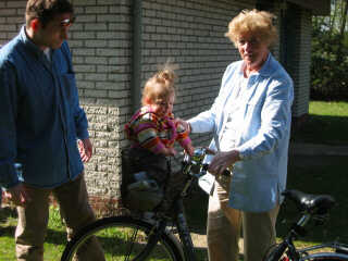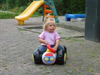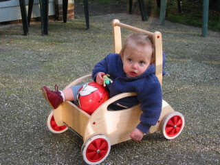 Na het aankleden en haar kammen gaat Marit lekker spelen, bijvoorbeeld in haar loopwagen of bij oma in de fietsmand.